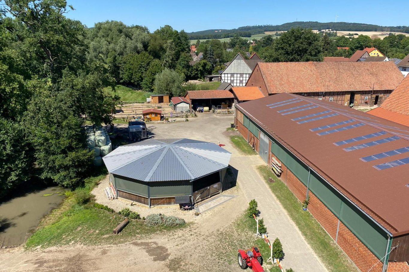 Er bietet eine umfassende Ausstattung für Pferdeliebhaber, einschließlich erstklassiger Reitmöglichkeiten mit einer geräumigen Reithalle, einem gut gepflegten Außenplatz, und zahlreichen Hindernissen für das Springtraining sowie für das Dressurtraining, einer Longierhalle und einem Wasserdurchritt.